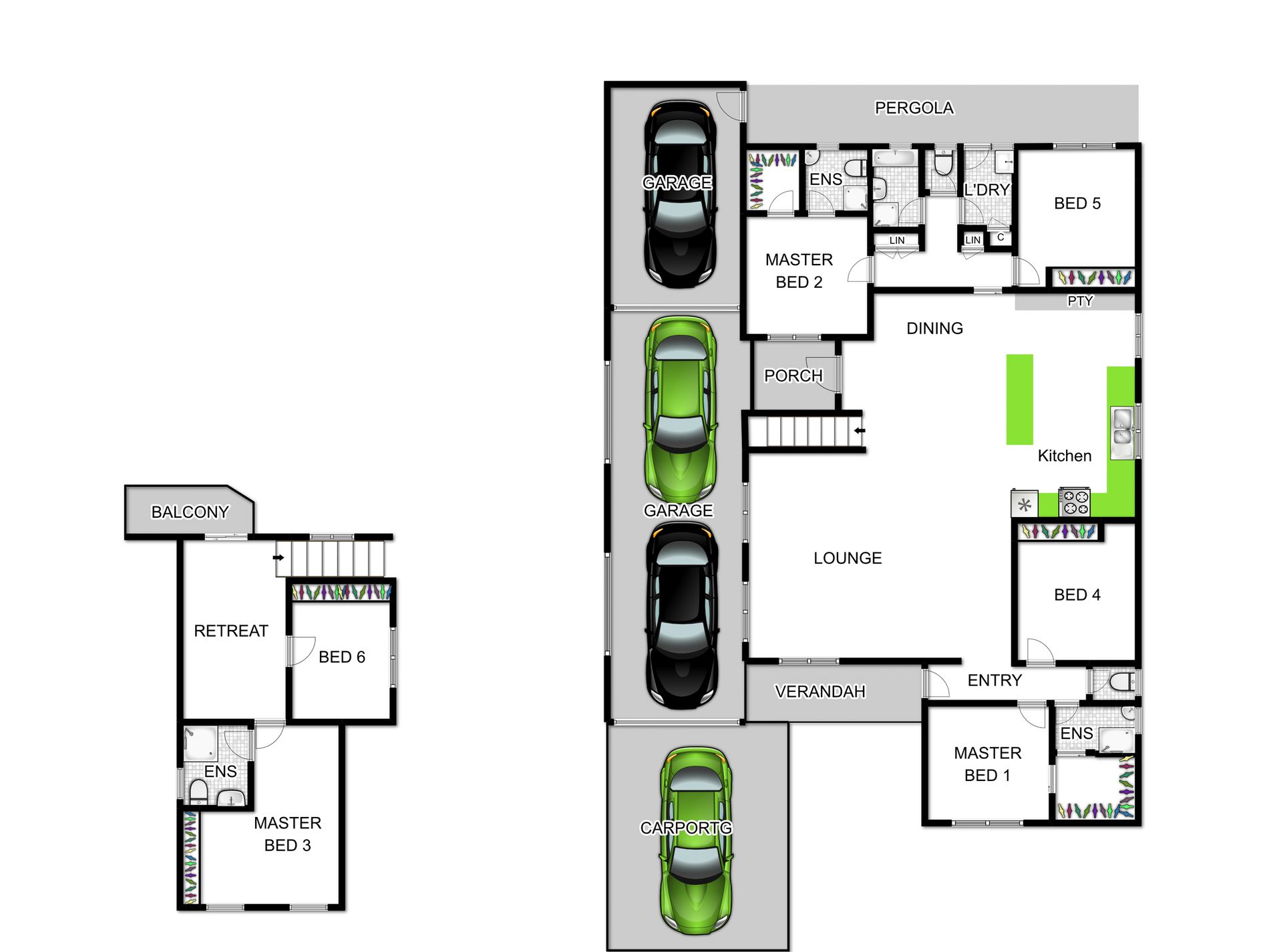 - Six bedrooms with built in robes consisting of three master bedrooms with their own ensuite